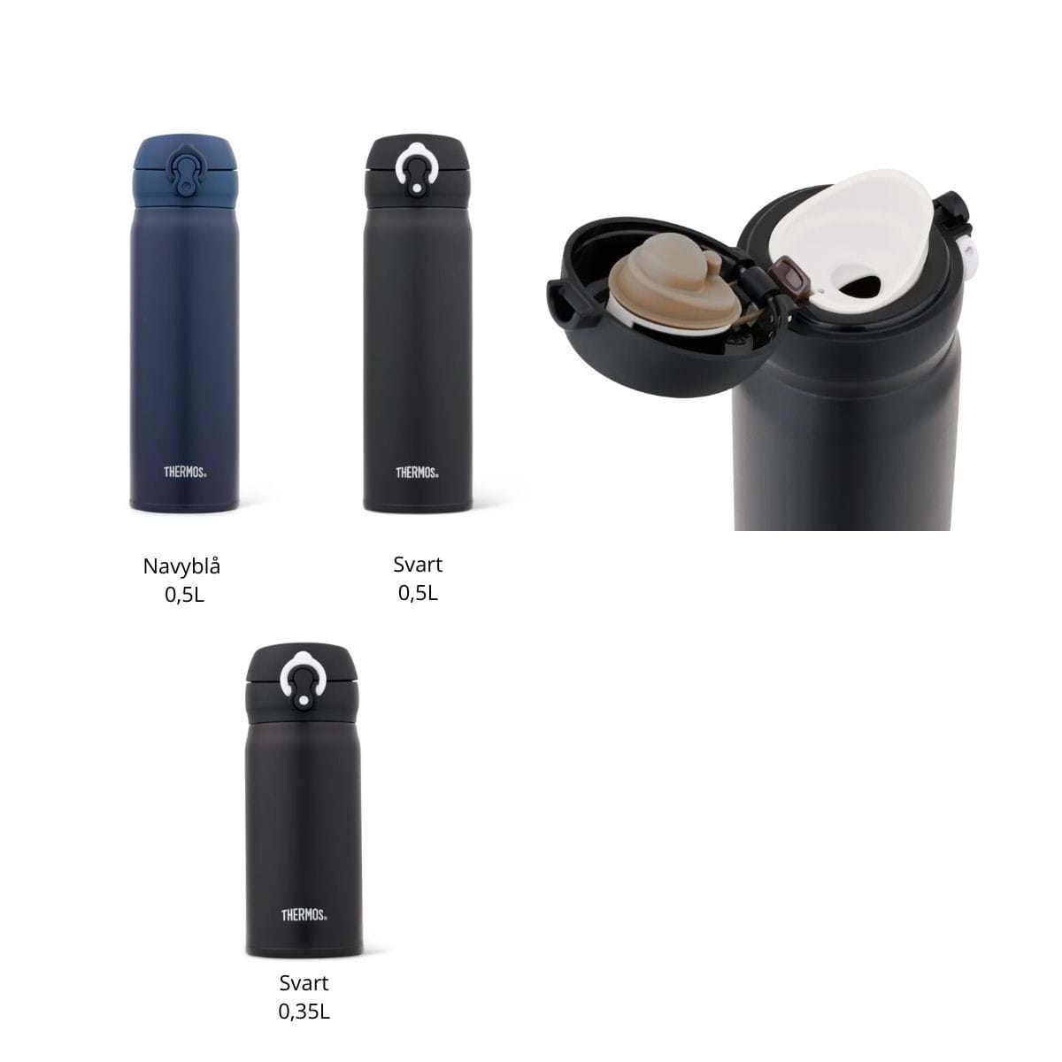 Lättviktstermos från Thermos i rostfritt stål. Helt läckagesäker. Greppvänlig och lätt att dricka ur. Passar bilens mugghållare.