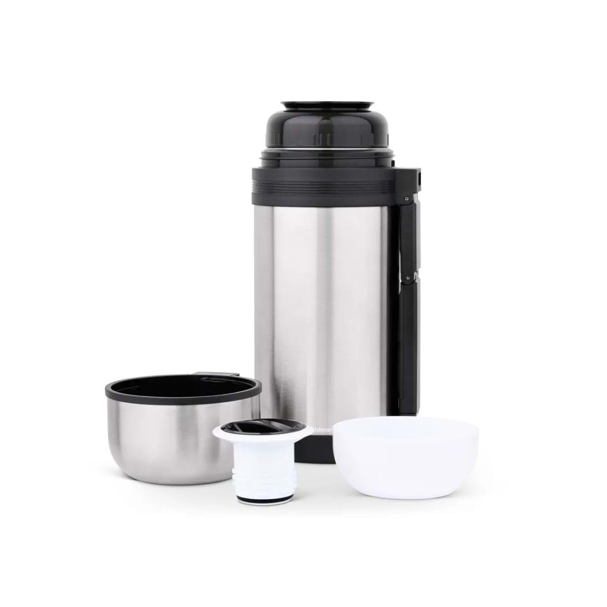 Stor termos för mat eller dryck med praktiskt handtag och med dubbla muggar. Borstad finish