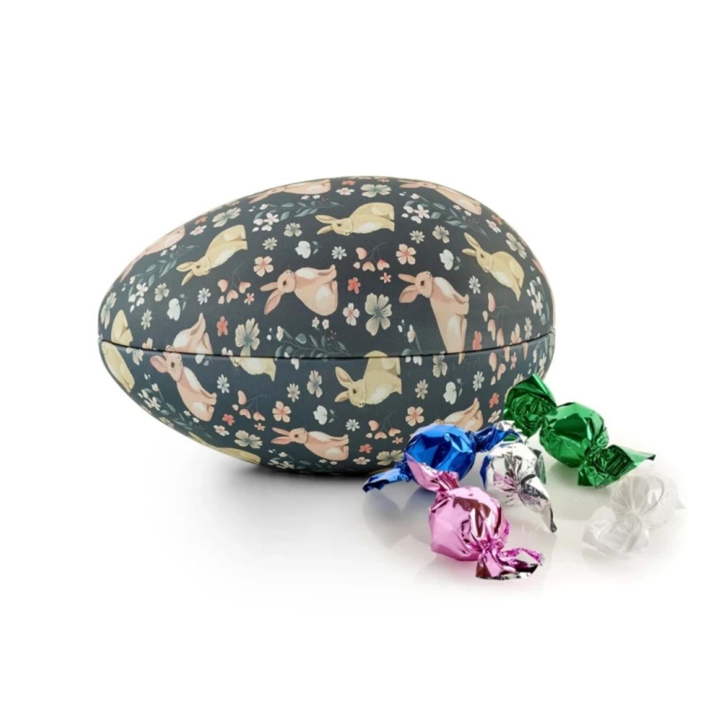 Ett dekorativt metallägg med ett lekfullt kaninmönster och små blommor, fyllt med 150 g mixade chokladkulor. En påskpresent som sprider glädje.