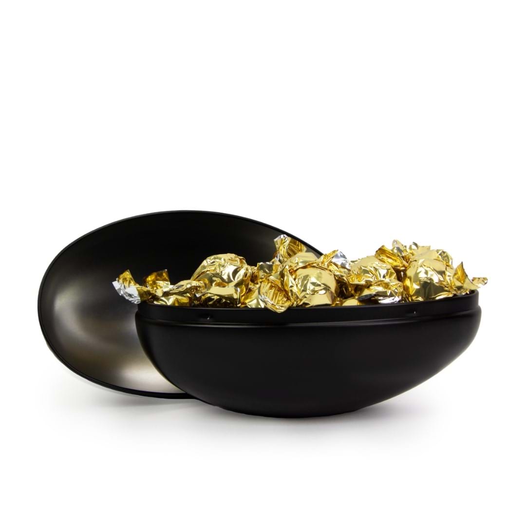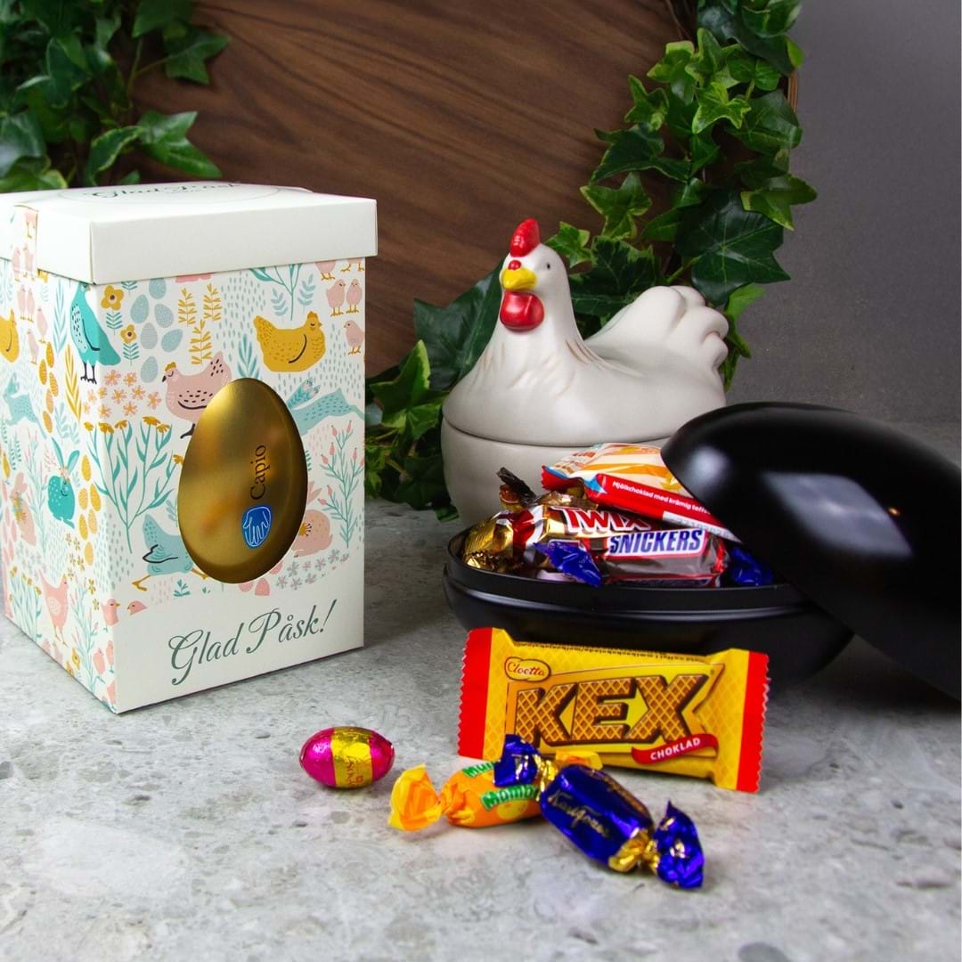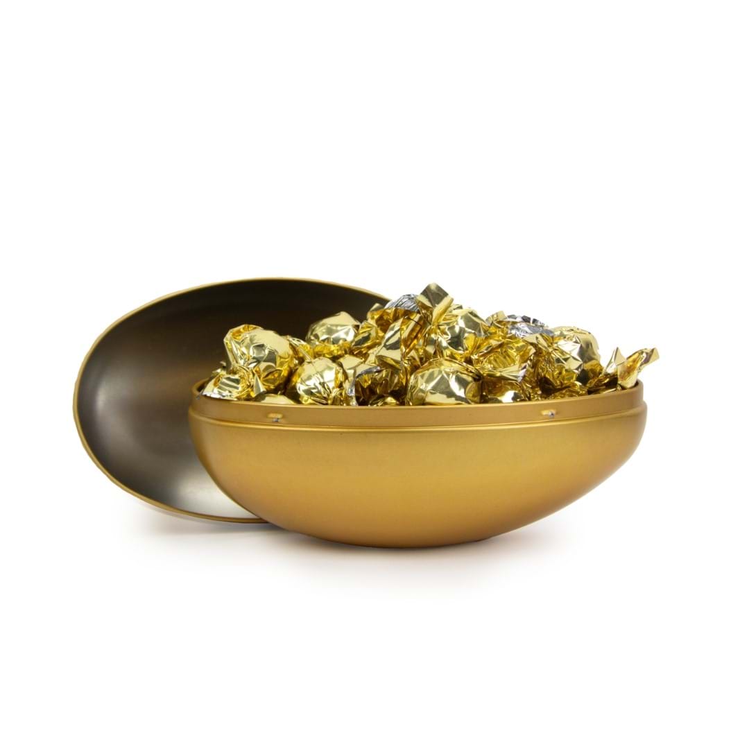 Ett exklusivt plåtägg i 18 cm, fyllt med inslaget varumärkesgodis eller pralinkulor. Finns att välja i svart eller guld och kan profileras med tryck av er logotyp direkt på ägget.