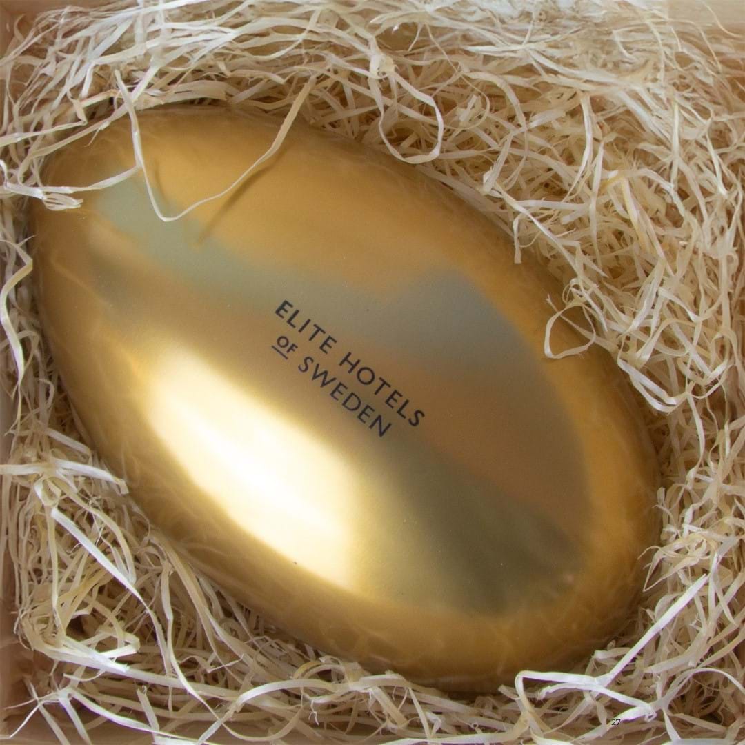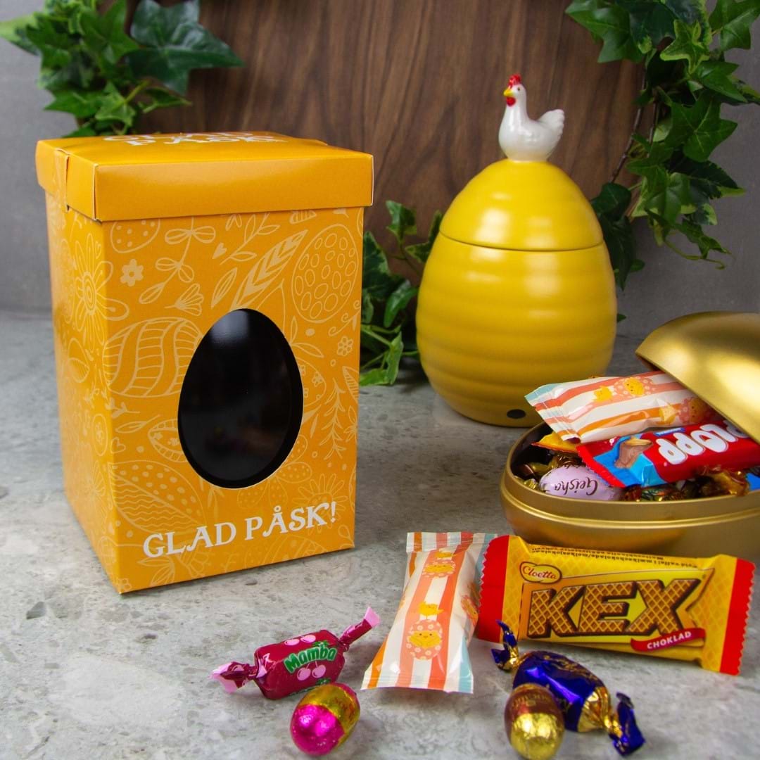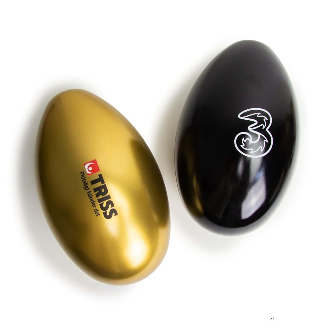 Ett exklusivt plåtägg i 18 cm, fyllt med inslaget varumärkesgodis eller pralinkulor. Finns att välja i svart eller guld och kan profileras med tryck av er logotyp direkt på ägget.