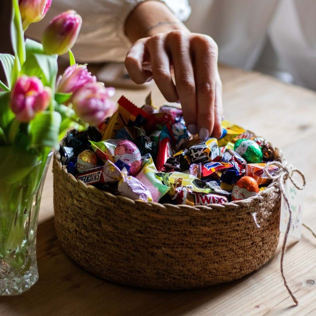 En tidlös och dekorativ korg i mellanformat, fylld med 2 kg påskgodis. En påskgåva som både imponerar och bjuder in till gemenskap.