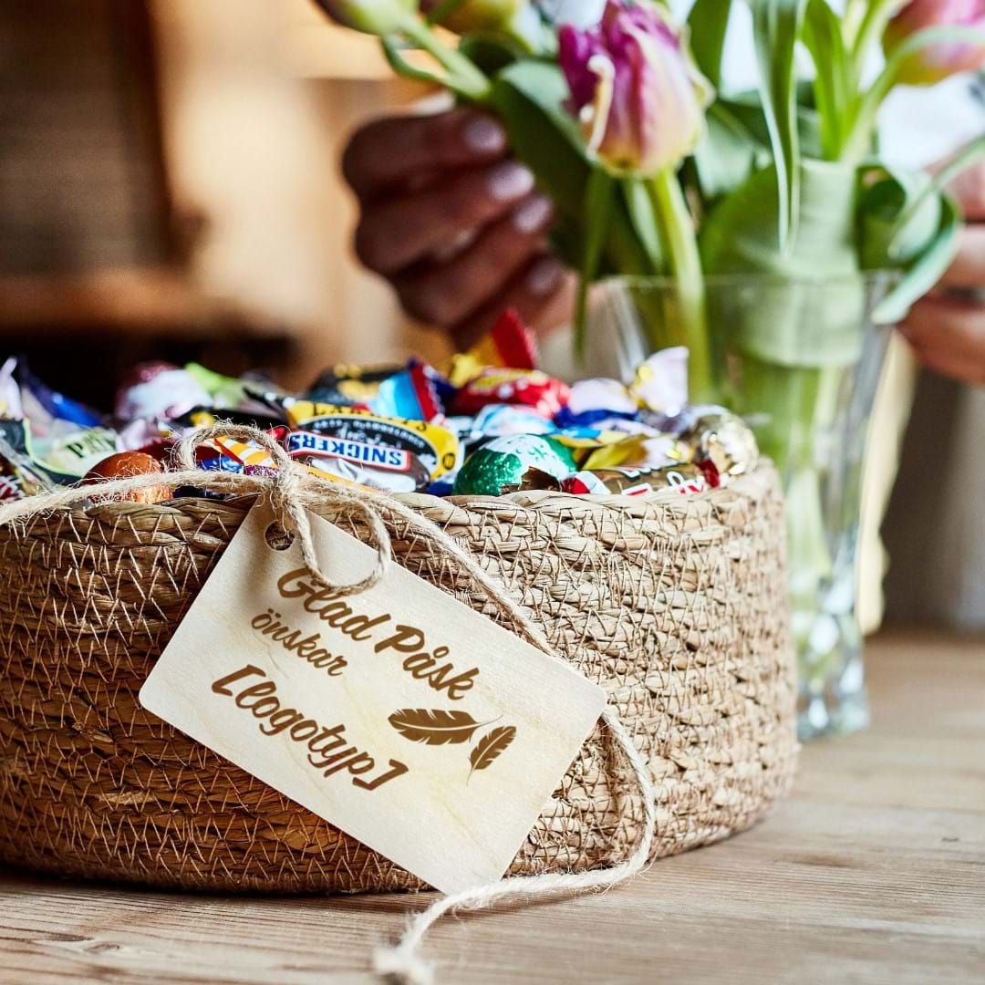 Välkommen till en påskgåva som verkligen imponerar. Denna korg i mellanformat kompletterar vilket lunchbord som helst och bjuder in till att ta en näve godis eller två. En perfekt gåva att ställa fram i fikarummet, på kontoret eller i receptionen.