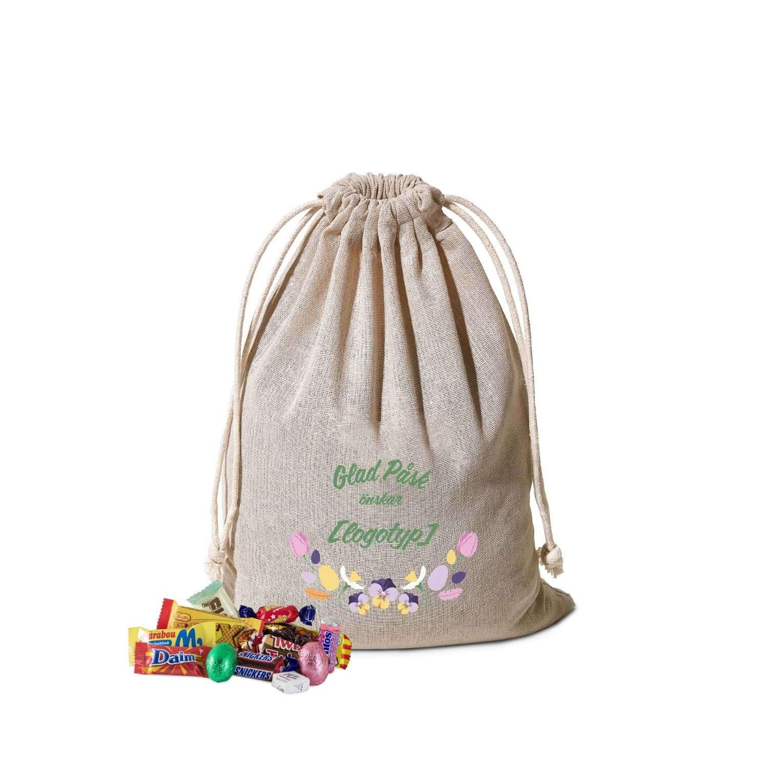 Påsksäcken fylls med 900 g inslaget kvalitetsgodis. För en tydlig och professionell avsändare kan säcken tryckas direkt med företagets logotyp och hälsning, eller kompletteras med ett påskkort med logotyp.