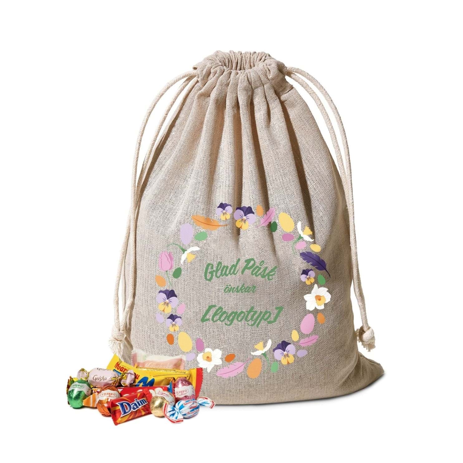 Denna stora påsksäck är en exklusiv företagsgåva till påsk när ni vill ge något utöver det vanliga. Den generösa mängden godis kombinerat med säckens robusta linnematerial skapar en tydlig wow-känsla och en hållbar produkt som gärna används även efter påsken.