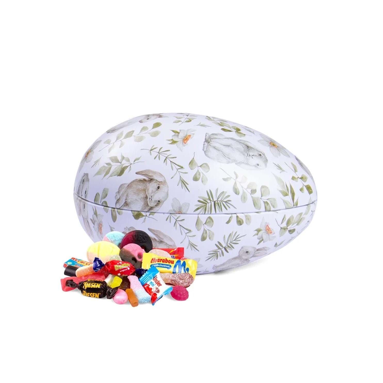 Ägget fylls med påskgodis och kan anpassas efter önskemål. För en personlig avsändare kan det kompletteras med kort eller banderoll med hälsning.
