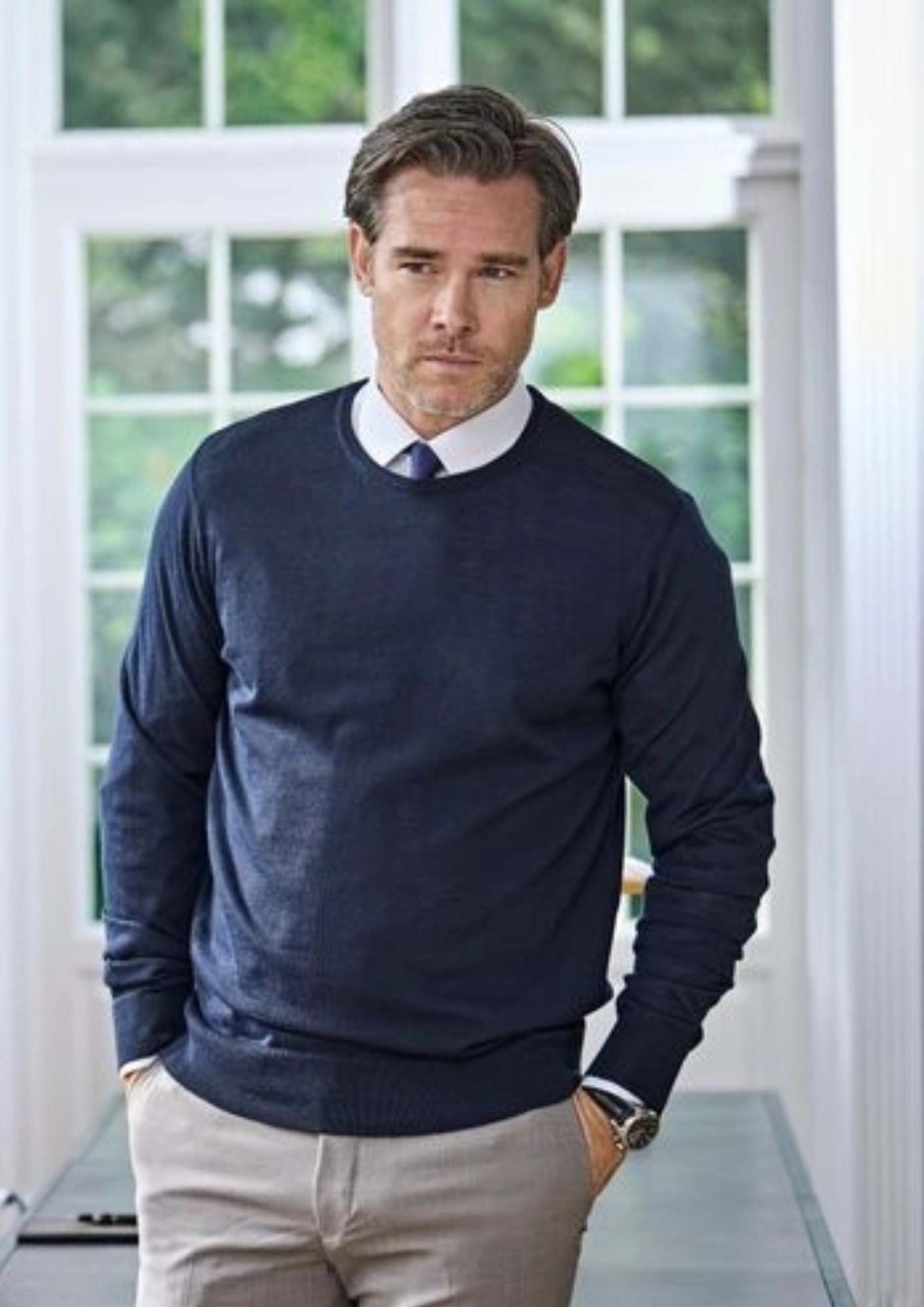 En klassisk stickad rundhalsad tröja tillverkad i en premium italiensk merinoulls- / polyakrylblandning. De ribbade detaljerna och halsringningen gör den perfekta kombinationen med en skjorta eller en cool t-shirt.