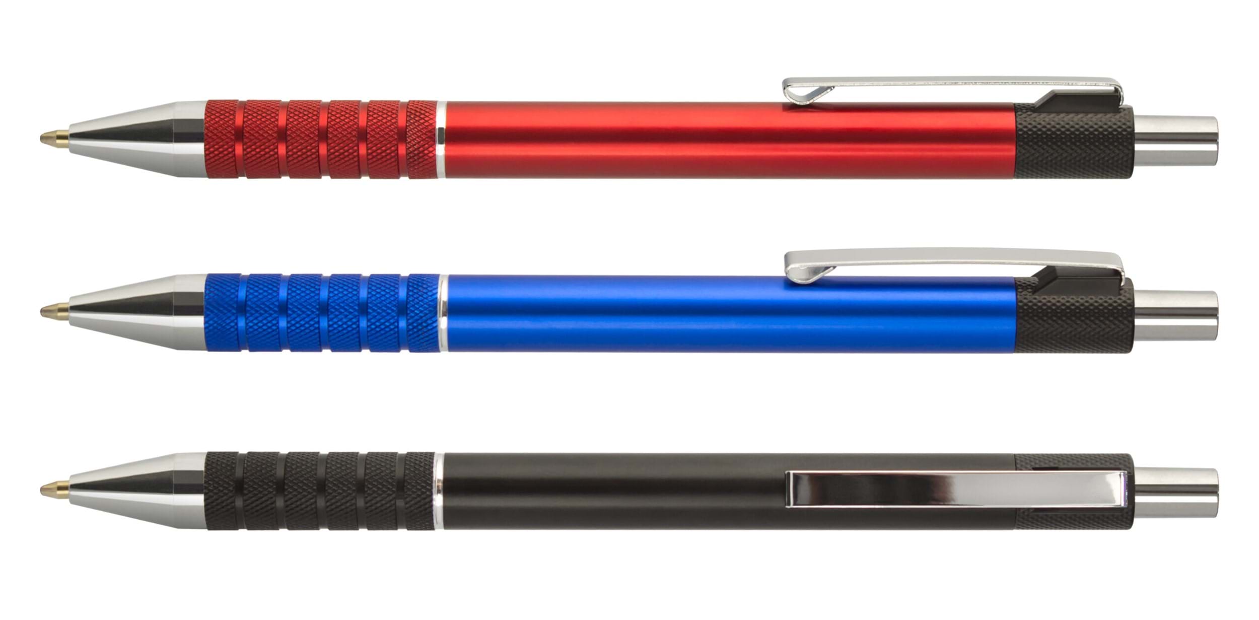 Eloxerad aluminiumpenna med kromade detaljer och flexibelt metallklips. Pennan har ett mönstrat grepp som gör att pennan ligger bra och bekvämt i handen. Endast lasergravyr i ljusgrå