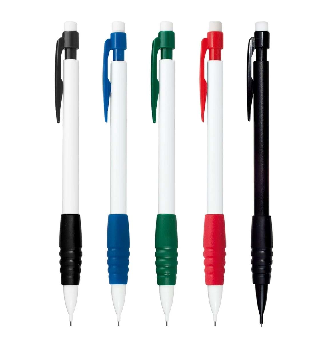 Stiftpenna med 2 extra blyerts-stift och mjukt gummigrepp.